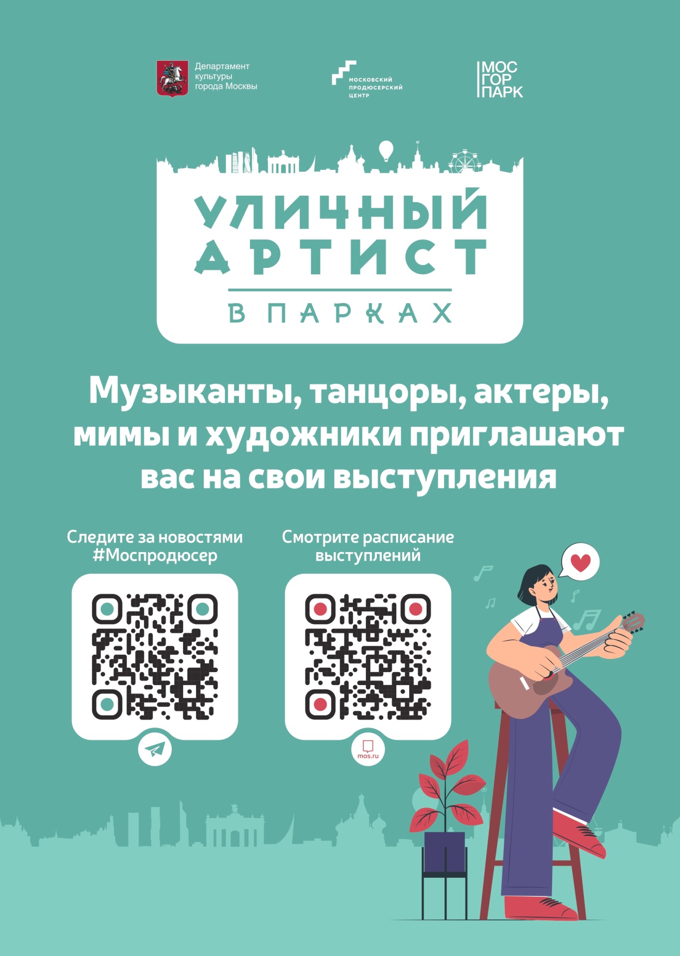 «Уличный артист в парках» – проект Московского продюсерского центра, в рамках которого победители выступают в парковых зонах Москвы. В этом году проходит второй сезон – заявки на участие в нем подали более 600 артистов. Победители смогут выступать на десятках площадок в парковых и культурных пространствах столицы, в том числе на территории Гончаровского парка
