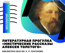 24 сентября в 13.00 в парке «Дубки», совместно с Библиотекой № 42 имени А.П. Платонова, пройдет литературная прогулка "Мистические рассказы" , посвященная 206-летию со дня рождения А.К. Толстого.